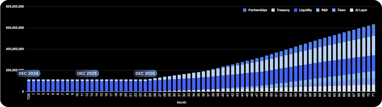 The team receives no tokens at launch and cannot completely benefit from their allocation for 10 years (vesting ends in December 2034), ensuring that value creation, not speculation, is the only path to reward.